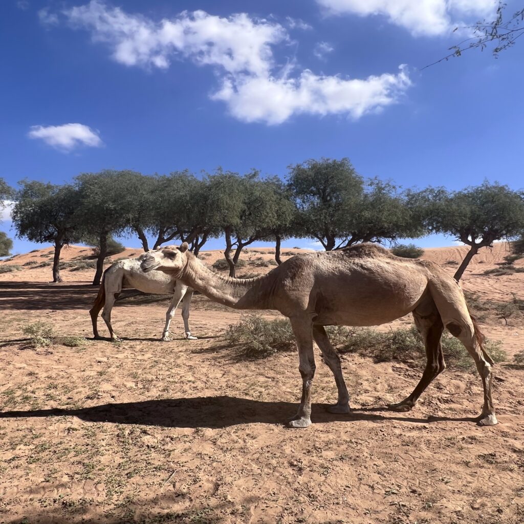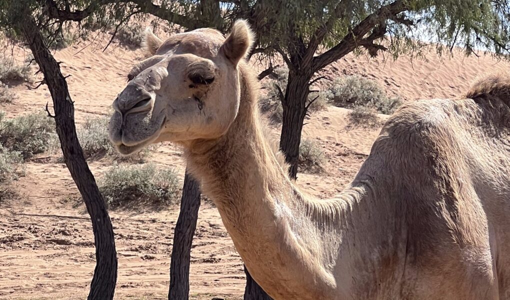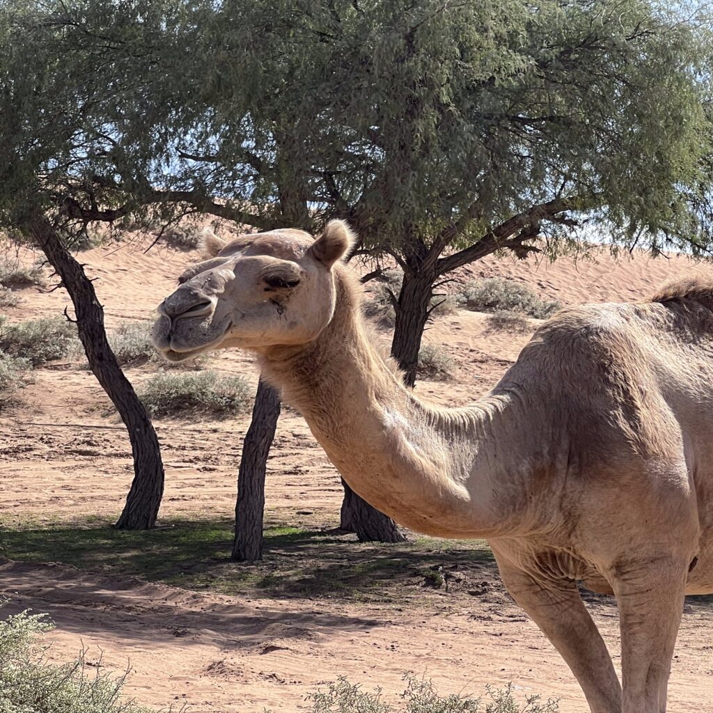 Ein unvergesslicher Moment: Mitten im Nirgendwo begegneten wir einer kleinen Kamelherde. Ohne Zäune oder Führer grasten die Tiere unter schattigen Bäumen, neugierig, aber gelassen.