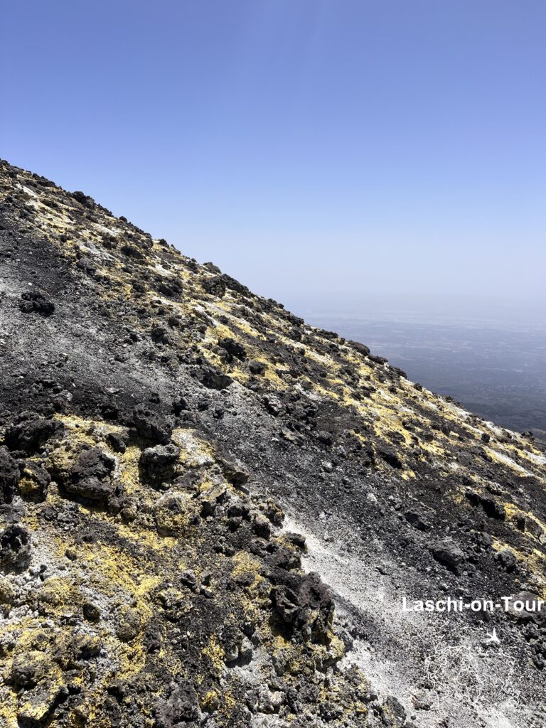 Ein echtes Highlight waren die grellgelben Schwefelfelder auf dem letzten Stück zum Kraterrand. Wie leuchtende Farbkleckse im schwarzen Lavagestein dampften sie vor sich hin, während aus Spalten immer wieder heißer Dampf entwich. Es fühlte sich an wie eine andere Welt – lautlos, unwirklich, aber intensiv.