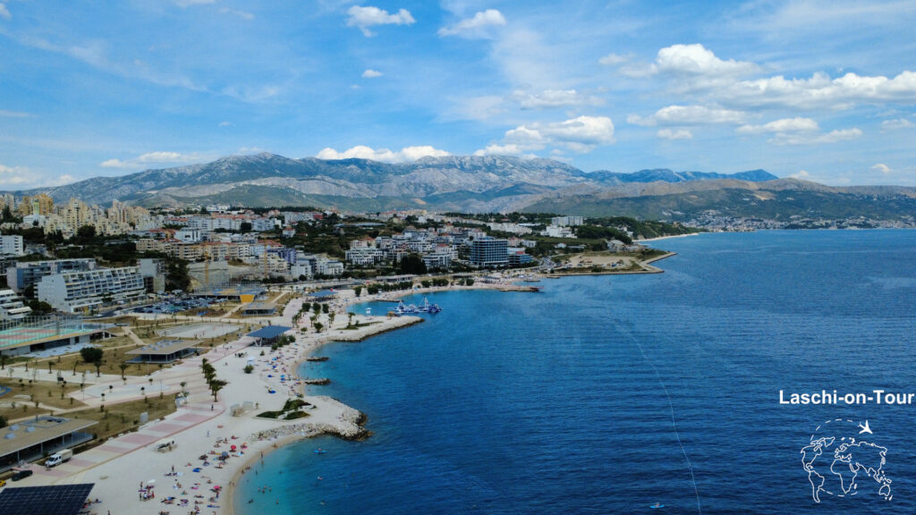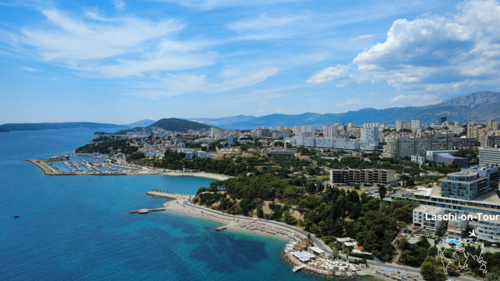 Ganz im Vordergrund der Stadtstrand Bačvice – flach abfallend, beliebt bei Einheimischen wie Reisenden.