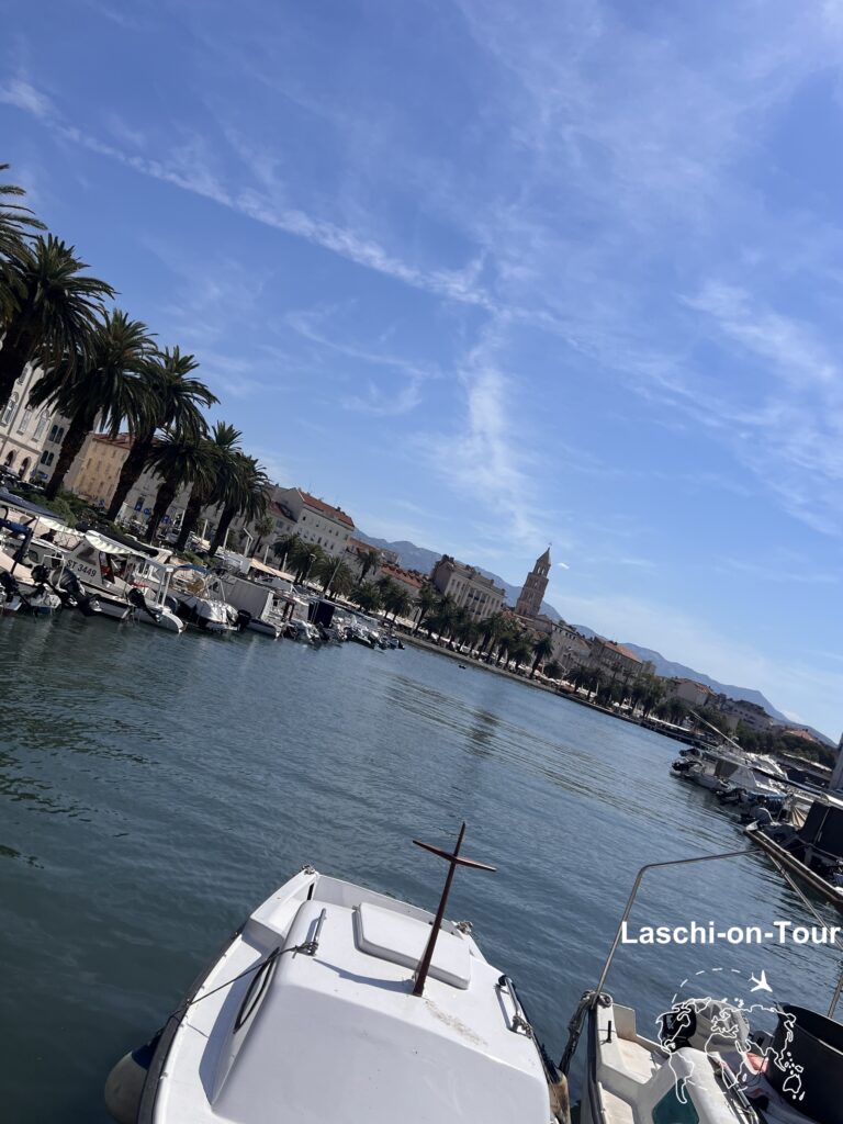 Vom Ufer aus betrachtet, sieht man die Riva – Splits belebte Hafenpromenade. Palmen säumen das Wasser, kleine Boote schaukeln im Sonnenlicht, und am Horizont ragt der Glockenturm der Kathedrale auf.